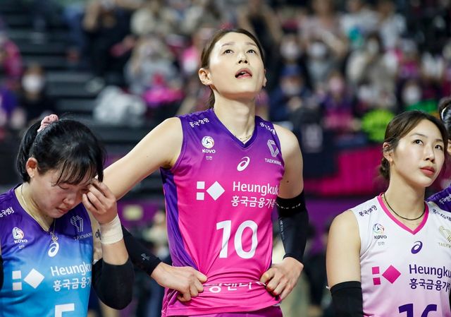 김연경이 지난 4월 6일 인천 부평구 삼산월드체육관에서 열린 여자 프로배구 2022-2023 V리그 챔피언 결정전 흥국생명과 한국도로공사 5차전 경기에서 세트 스코어 3대2로 패배 후 아쉬워하고 있다. / 뉴스1