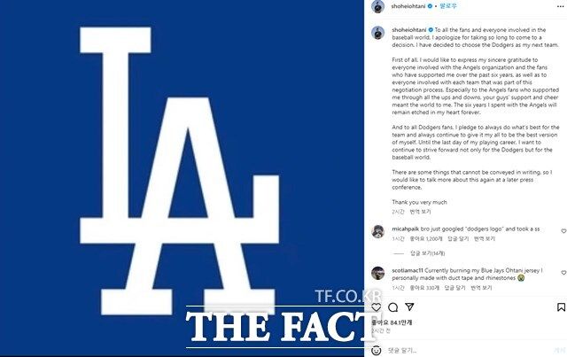 오타니 쇼헤이는 "팬 여러분과 야구계 관계자 여러분께 결정을 내리는 데 너무 오랜 시간이 걸린 점에 대해 사과드린다. 나는 다저스를 다음 팀으로 선택하기로 결정했다"라고 이적 소식을 밝혔다. 그는 "먼저 지난 6년 동안 저를 응원해주신 에인절스 구단과 팬 여러분, 그리고 이번 협상 과정에 참여해주신 각 구단 관계자 여러분께 진심으로 감사의 말씀을 드린다. 특히 모든 우여곡절 속에서도 저를 응원해주신 에인절스 팬 여러분들의 응원과 성원은 저에게 큰 힘이 되었다. 에인절스와 함께한 6년은 제 마음속에 영원히 새겨질 것이다"라고 말했다.
