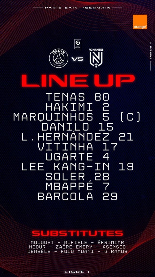 홈 팀 PSG는 4-3-3 전형을 들고나왔다. 킬리안 음바페, 바르콜라, 카를로스 솔레르, 이강인, 마누엘 우가르테, 비티냐, 뤼카 에르난데스, 다닐루 페레이라, 마르퀴뇨스, 아슈라프 하키미, 아르나우 테나스가 출격한다. 노르디 무키엘레, 밀란 슈크리니아르, 체르 은두르, 워렌 자이르-에메리, 곤살루 하무스, 우스만 뎀벨레, 마르코 아센시오, 랑달 콜로 무아니 등은 벤치에서 대기한다.