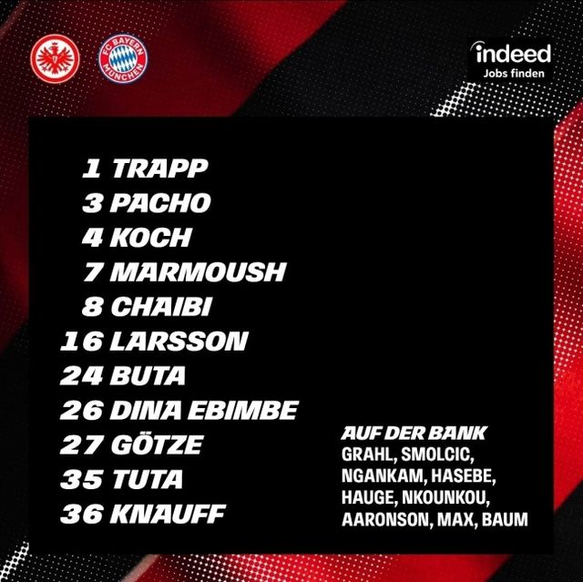 킥 오프를 앞두고 양 팀 선발 명단이 공개됐다. 홈팀 프랑크푸르트는 수비를 강화한 3-4-2-1 포메이션을 들고 나왔다. 케빈 트랍이 골키퍼를 보는 가운데 윌리엄 파초, 로빈 코흐, 투타가 백3를 형성했다.