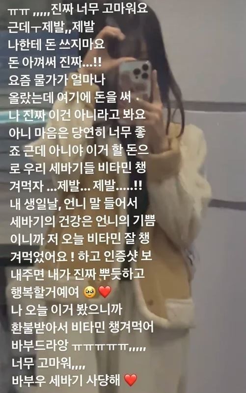이세희는 "내 생일 날, 언니 말 들어서 세바기의 건강은 언니의 기쁨이니까 '저 오늘 비타민 잘 챙겨먹었어요!' 하고 인증샷 보내주면 내가 진짜 뿌듯하고 행복할 거예요"라고 말했다.