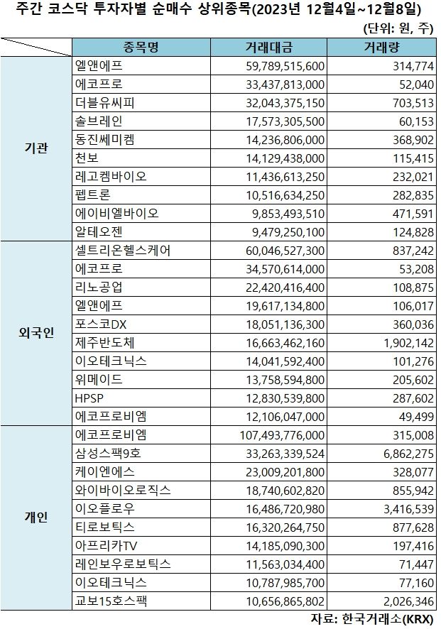 기관 '엘앤에프'·외인 '셀트리온헬스케어'·개인 '에코프로비엠' 1위 [주간 코스닥 순매수- 12월4일~12월8일]