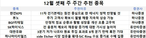 한전KPS에 대해선 "11차 전기본 초안 발표에 대비해 12월에는 원전 밸류체인에 관심이 필요하다"며 "11차 전기본에는 원전 중심으로 한 에너지 정책이 반영될 것"이라고 기대했다.