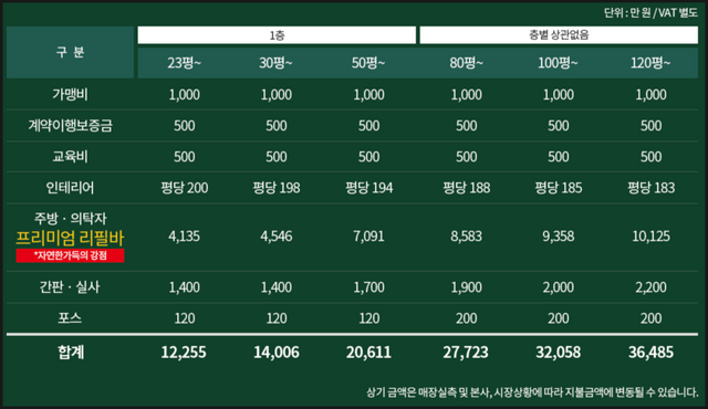 그 외 인테리어, 주방, 의탁자 ,간판, 실사, 포스 비용은 평형 별로 상이합니다.
