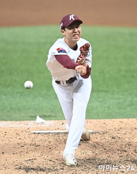 선발 등판한 김동혁(키움 히어로즈)이 호투했다. 그는 대만 타선을 상대로 5이닝 동안 몸에 맞는 공 1개만 내주고, 안타는 하나도 허용하지 않았다.