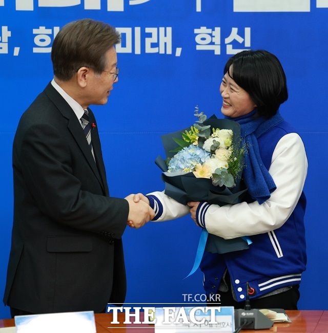 이재명 더불어민주당 대표가 11일 오전 서울 여의도 국회에서 열린 1차 인재영입식에서 박지혜 변호사와 악수하고 있다. /뉴시스