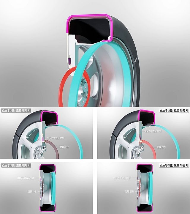 해당 기술은 형상기억합금으로 이뤄진 모듈이 평상시에는 휠과 타이어 내부에 숨어있다가 전기적 신호를 받으면 타이어 바깥으로 돌출돼 스노체인의 역할을 하는 원리다.