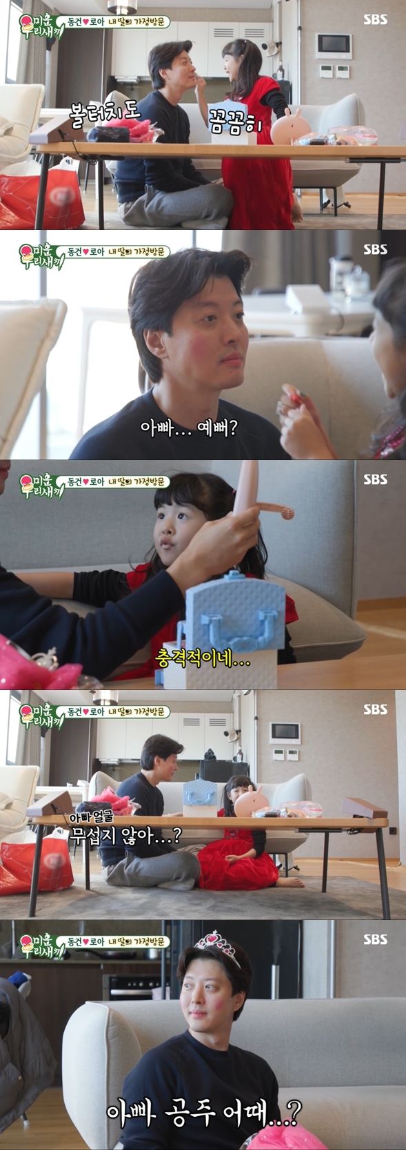 딸을 위해 공주 세트까지 준비한 그. 왕관을 쓰고 요술봉을 든 로아가 "아빠 내가 화장 한 번 해줄게"라고 하자, 이동건은 당황하면서도 딸에게 얼굴을 내주었다.