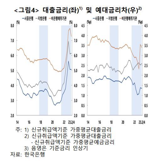 이러한 스프레드 확대는 예금취급기관의 재무 변동성을 키우는 것으로 나타났다. 한은은 스프레드 확대가 총자산수익률 변동성을 키워 수익 안정성을 떨어뜨린 것으로 해석했다. 대출 금리가 업권별로 비슷한 수준으로 상승하다 보니, 예금 금리가 큰 폭으로 상승한 시중은행과 비은행권에서 예대금리차가 더 축소됐다.