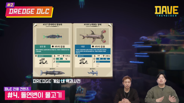 ‘데이브 더 다이버’의 황재호 디렉터와 우찬희 기획 리더는 이번 영상을 통해 게임의 주요 업데이트 정보를 전했다. 핵심은 지난 8일 더 게임 어워드 2023을 통해 발표된 ‘드렛지’ 콜라보 콘텐츠와 각종 개선 사항으로, 관련 업데이트는 오는 15일 진행될 예정이다.