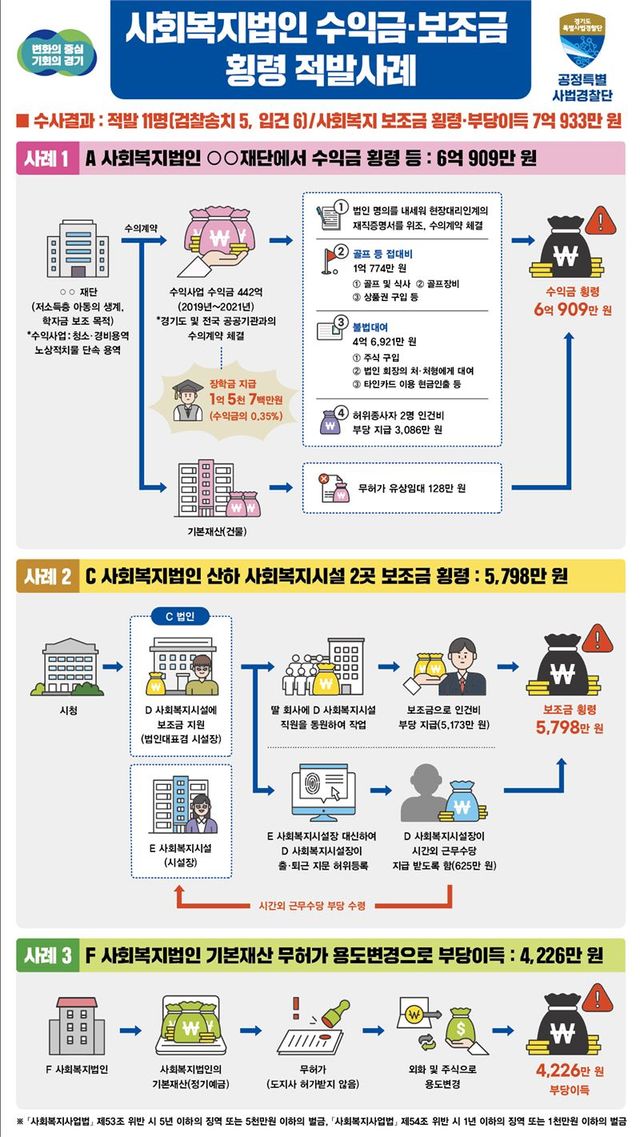 이 밖에도 A사회복지법인 수익사업에 필요한 자격증 대여의 대가로 허위 종사자를 등록해 인건비 3천86만 원을 지급한 혐의와 법인의 기본재산을 도지사의 사전 허가 없이 불법으로 임대하여 128만 원 부당이득을 수취한 혐의 등에 대해 사회복지사업법 위반으로 곧 송치할 예정이다.