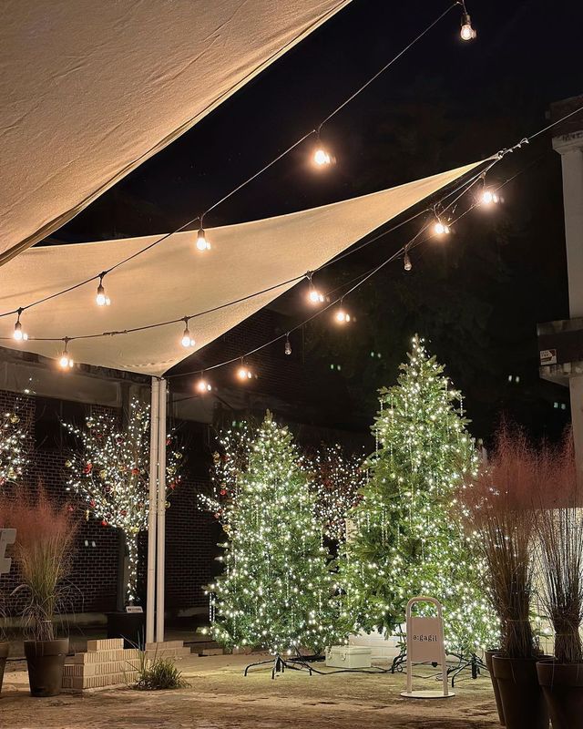 트리 장식 외에도 주변 벽과 지붕 그리고 맞은편까지 밤이 되면 조명에 매료되고 만다. 베이커리도 유명한 맛집이라, 빵들도 맛있고, 오색찬란 타르트들도 커피와 곁들이기 딱 좋다.