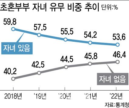 자녀가 없는 무자녀 비율도 역대 최고로 높아졌다. 초혼 신혼부부를 기준으로 자녀가 없는 부부는 46.4%로 전년(45.8%)대비 0.6%포인트 상승했다. 평균 자녀 수도 0.65명으로 전년보다 0.01명 줄어 사상 최저 수준으로 떨어졌다. 통계청 관계자는 “사회 전체적으로 저출산이 가속화하는 양상”이라며 “신혼부부에서도 이 같은 현상이 두드러지고 있다”고 설명했다. 지난해 우리나라 합계출산율 역시 0.78명으로 1970년 관련 통계를 작성한 이후 최저치를 기록한 바 있다.