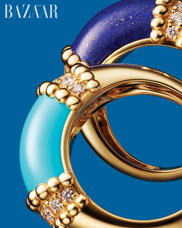 옐로 골드에 라피스라줄리와 다이아몬드를 장식한 ‘뻬를리 컬러’ 반지, 옐로 골드에 튀르쿠아즈와 다이아몬드를 세팅한 ‘뻬를리 컬러’ 반지는 모두 가격 미정 Van Cleef amp; Arpels.