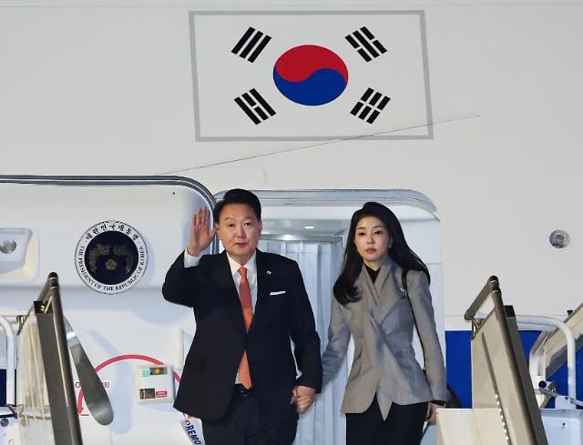 当地时间11日,韩国总统尹锡悦(左)和夫人金建希搭乘总统专机“空军一号”抵达荷兰阿姆斯特丹史基浦机场,正式开始对荷兰进行为期五天的国事访问。