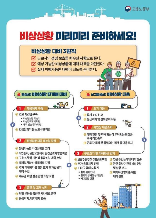 이를 위해 '사업장 비상상황 대비 가이드라인'에는 비상상황 대응체계 구축 방법, 비상상황 발생 시 대응 원칙 및 절차뿐만 아니라 노.사가 함께하는 교육.훈련 방법까지 수록되어 있다. 아울러, 비상상황 대응 요령 포스터와 한 장으로 요약된 가이드라인 홍보자료도 함께 배포했다.