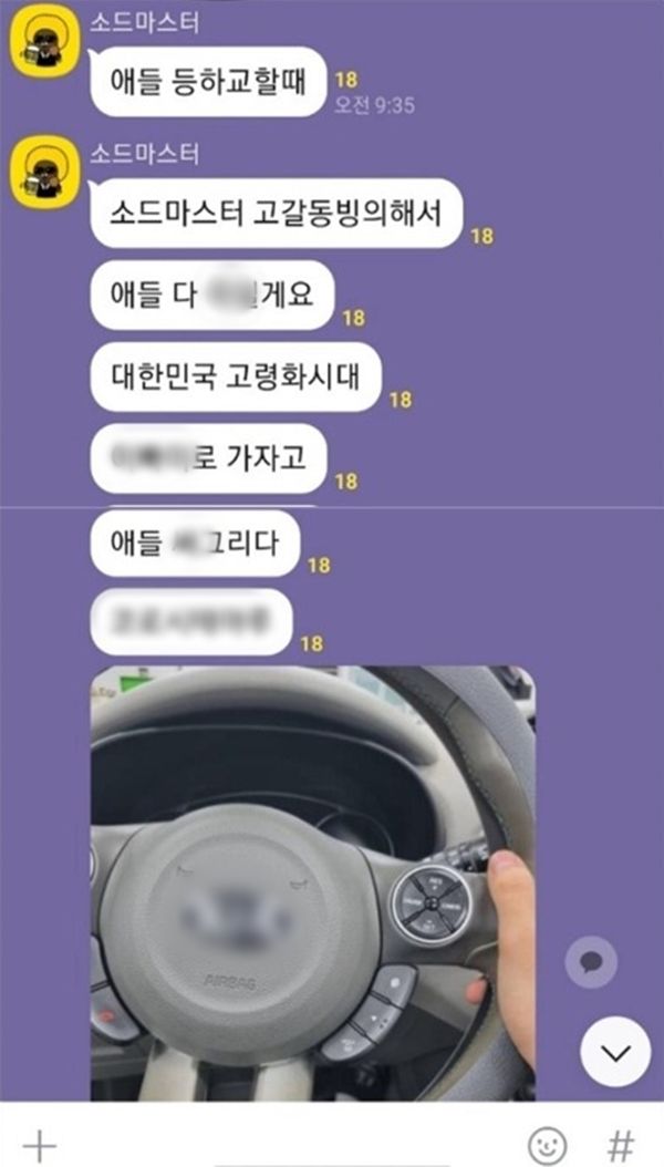 사건 당시 그는 단체 채팅방에 "XX초등학교 좌표 따서 아이들을 다 XX겠다"는 내용과 함께 차량 핸들을 손으로 잡고 있는 사진도 함께 올린 것으로 파악됐다.