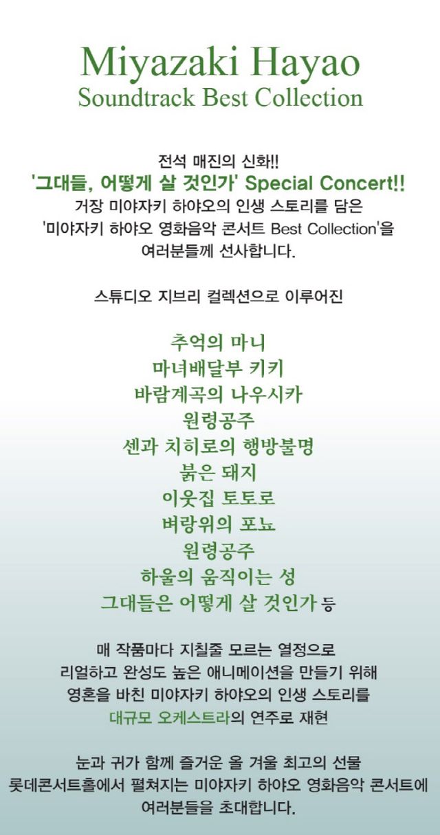 이번 음악회는 영화 음악으로 미야자키 하야오의 인생을 되돌아 본다. 오케스트라와 연주자는 영화 ‘원령공주’의 ‘데몬 갓(Demon God)’, ‘센과 치히로의 행방불명’ 중 ‘언제나 몇 번이라도’와 ‘생명의 이름’ 등을 연주한다. 이밖에도 ‘이웃집 토토로’, ‘하울의 움직이는 성’의 메인주제곡과 함께 신작 ‘그대들은 어떻게 살 것인가’의 OST를 만나볼 수 있다.