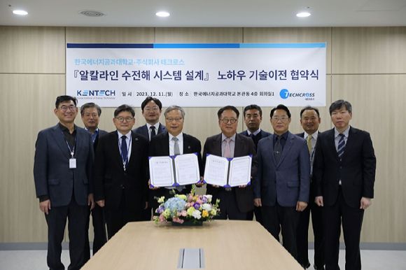 켄텍은 11일 오후 윤의준 총장, 박진호 연구부총장, 한종희 수소에너지연구소장, 김창희 교수와 테크로스 박석원 대표, 권경안 연구소장 등 양측 관계자 15명이 참석한 가운데 켄텍 행정강의동 4층 회의실에서 ‘수전해 노하우 기술이전 협약식’을 가졌다.