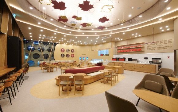 유기적인 곡선 디자인과 밝은 우드톤 공간 디자인에 메이플 레드컬러를 포인트로 활용했으며, 팀홀튼만의 따뜻한 브랜드 정서가 잘 담겨있다.
