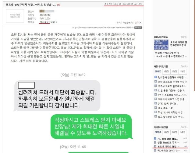 A씨는 13일 오후 1시32분에도 ‘포르쉐 불법주정차 빌런…아직도 정신을?’이라는 제목으로 관련 글 하나를 더 게재했다. 그에 따르면 이날 오전 11시경, B씨에게 보배에 올린 글 링크를 문자메시지로 전송했다. B씨는 12시경, 주민 민원으로 경찰들이 출동하자 ‘주차 위반 스티커를 떼야 이동하겠다’며 버텼고 결국 관리소서 스티커를 떼어냈다.
