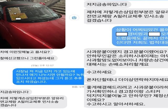 그러자 B씨는 “제 차에 저렇게 손상 입힌 부분은 앞 유리 전면 교체랑 A필러 교체 후 민사소송 걸겠다”고 대응했다.