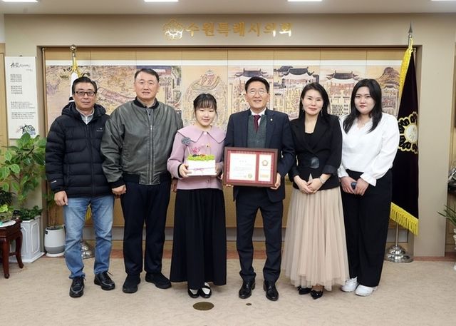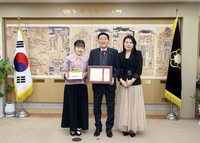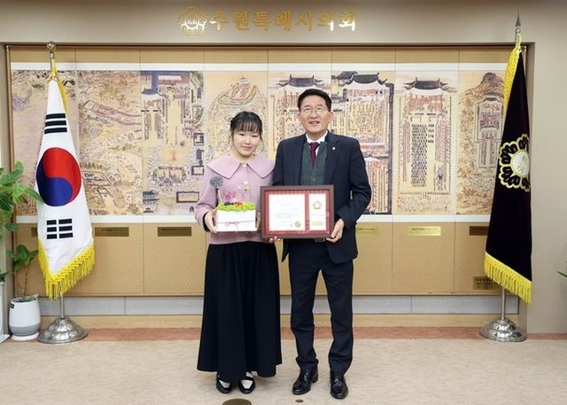 김기정 의장은 “박고은 학생이 2023년 전주대사습놀이 학생전국대회‘서공철류가야금산조’ 현악부분 장원을 차지하는 등, 뛰어난 실력으로 수원을 널리 알리고 전통문화 계승과 발전에 지대한 공이 크므로 표창을 하게 되었다”며 “수원시민의 한 사람으로 자긍심을 갖게 해 주어 기쁘다”고 말했다.