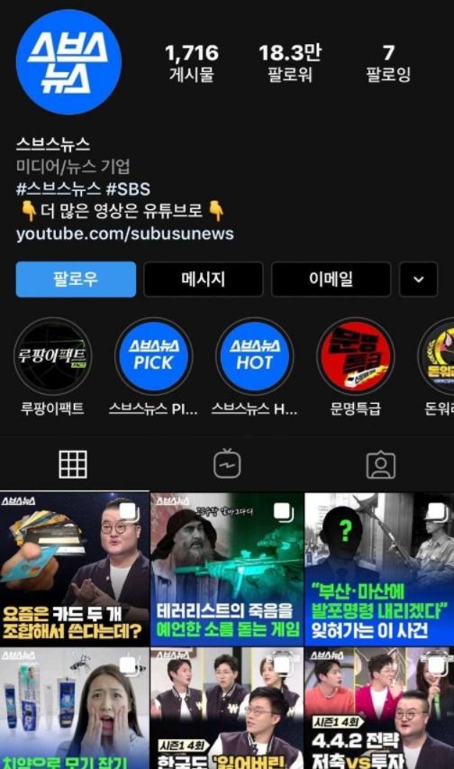 SBS에서는 스브스 뉴스라는 이름으로 유튜브와 인스타를 개설해 사람들과 소통해왔다.