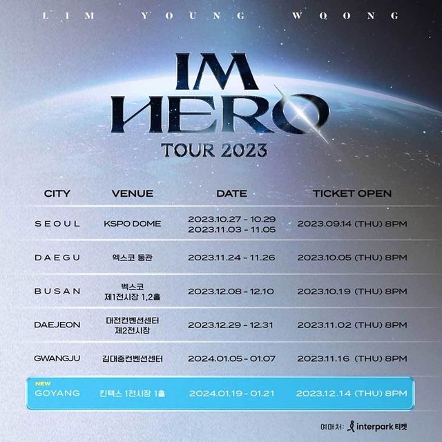 오는12월29일,30일,31일에는대전컨벤션 센터제2전시장에서임영웅대전콘서트가진행된다.내년1월5일,6일,7일에는광주로자리를옮겨김대중컨벤션센터에서팬들을만날예정이다.전국투어피날레인임영웅앙코르콘서트는내년5월25일,26일서울월드컵경기장에서개최된다.