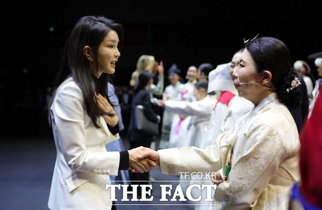김건희 여사가 13일(현지시간) 오후 암스테르담 아파스 라이브에서 열린 답례문화행사에서 공연관람을 마친 뒤 공연자들을 격려하고 있다. /뉴시스