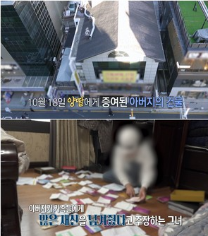아버지에게 지극정성을 다했던 모습과 다르게 강 씨(가명)의 충격적인 언행은 끝없이 이어졌다고 한다. 심지어 아버지와 강 씨(가명)가 부녀 사이의 선을 넘는 정황도 발견됐다는 주장이다. 고심 끝에 아들들은 아버지 송창우(가명) 씨에게 증거 자료들을 보여주며 강 씨(가명)의 실체를 알렸고, 아버지도 배신감에 그녀와의 관계를 정리하기로 결심했었다고 한다. 그럼에도 불구하고 지난 10월, 양녀 강 씨(가명)에게 450억 원 상당의 건물과 20억 원 규모의 아파트가 단독 증여된 이유는 무엇일까? 54세 중년의 나이에 입양돼 강남의 건물주가 돼 인생 역전을 한 양녀 강 씨(가명)를 둘러싼 실화를 오늘(14일) 밤 방송하는 MBC '실화탐사대'에서 추적한다.