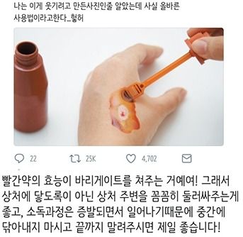 이를 본 누리꾼들은 "그러면 머리 아플 때 군대에서 빨간 약은 왜 주는 거?" "저거 바르고 타이레놀 먹으면 암도 완치지ㅋㅋㅋ" 등의 반응을 보였습니다.