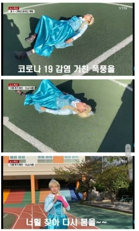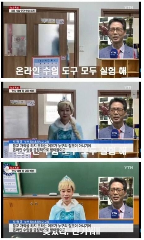 한 초등학교의 교장선생님은 등교를 하지 못하는 것이 누군가의 잘못이 아니기에 온라인 수업을 긍정적으로 받아들일 수 있게 아이들이 좋아하는 엘사 코스프레를 하고 학생들을 위한 영상을 올려 업로드 했습니다.