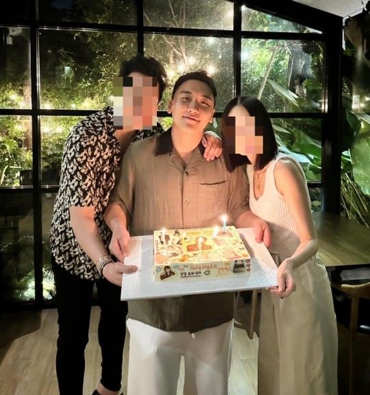 공개한 사진에는 지인들 사이엣 케이크를 들고 행복한 표정을 짓고 있는 승리 모습이 담겨있다. 케이크에는 승리 얼굴이 그려져 있다.