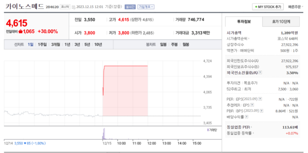 15일 한국거래소에 따르면 카이노스메드는 이날 낮 12시 1분 기준, 전일대비 30%(1065원) 상승한 4615원에 거래됐다. 이날 장중 고가 4615원, 저가 3800원을 기록하고 있다.