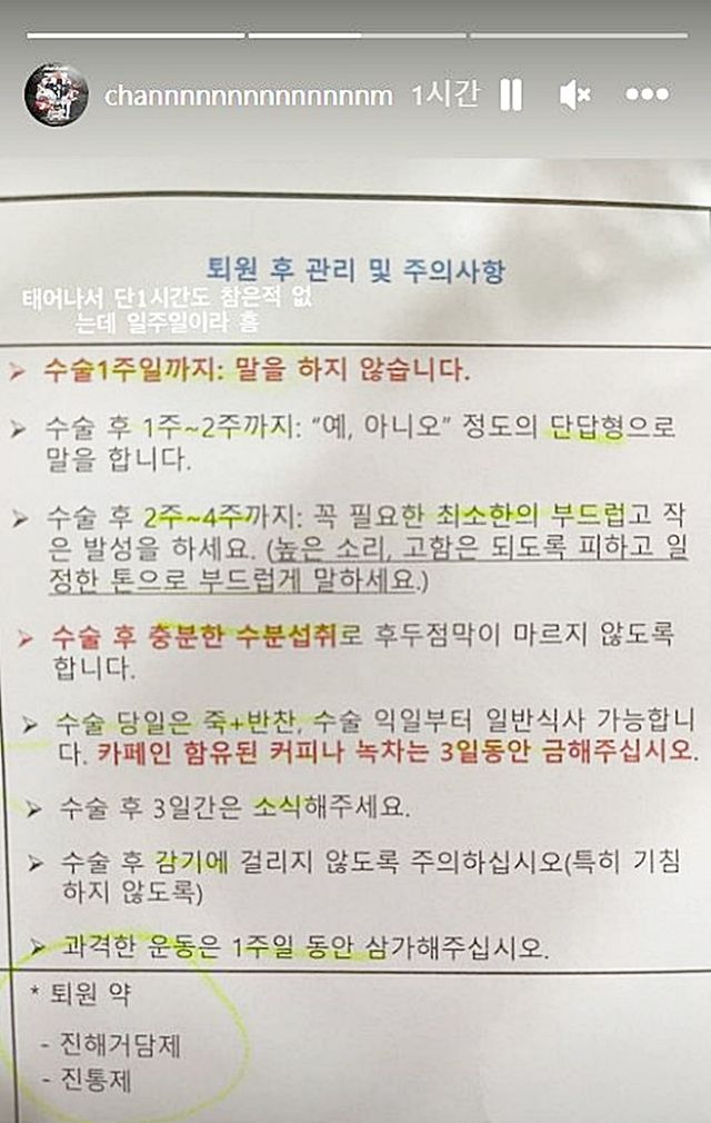 사진 속 임찬규는 병상에 누워 있었고 손목에는 생년월일 등이 적힌 환자 팔찌가 있었다. 15일 공개한 다른 사진에는 병원 측이 임찬규에게 당부한 '퇴원 후 주의 사항'이 있었다.