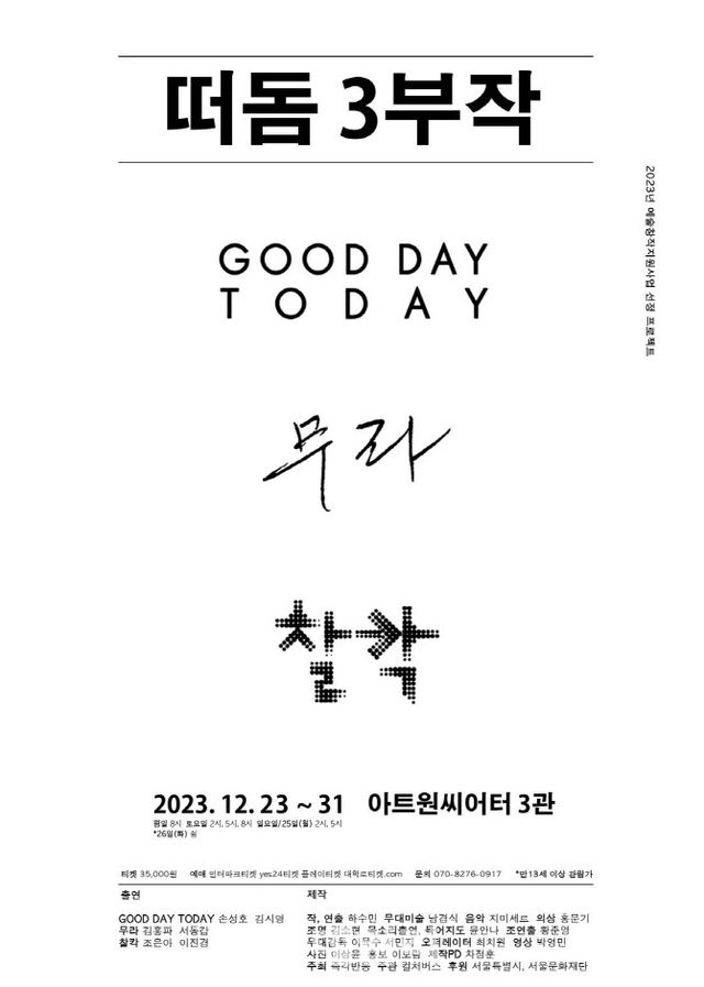 연극 ‘새들의 무덤’, ‘육쌍둥이’를 선보여온 극단 즉각반응이 극단의 시작이라 할 수 있는 세 편의 연극 ‘굿 데이 투데이’(Goo day today), ‘무라’, ‘찰칵’을 무대에 올린다. ‘떠돔 3부작’으로 묶인 3편의 연극은 ‘떠돔’과 ‘마주함’을 주제로 개인과 가족, 사회, 세계를 살펴보는 2인극으로 구성돼 있다. 1인 가족 시대에 ‘가족’이란 어떤 의미이며, 지금 우리에게 필요한 것은 ‘마주함’이라는 질문을 제시한다. 2023년 김상열연극상을 수상한 연출가 하수민의 작품으로 배우 손성호, 김시영, 김홍파, 서동갑, 조은아, 이진경 등이 출연한다.