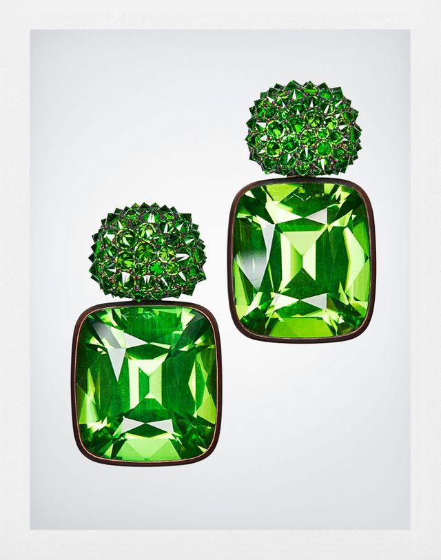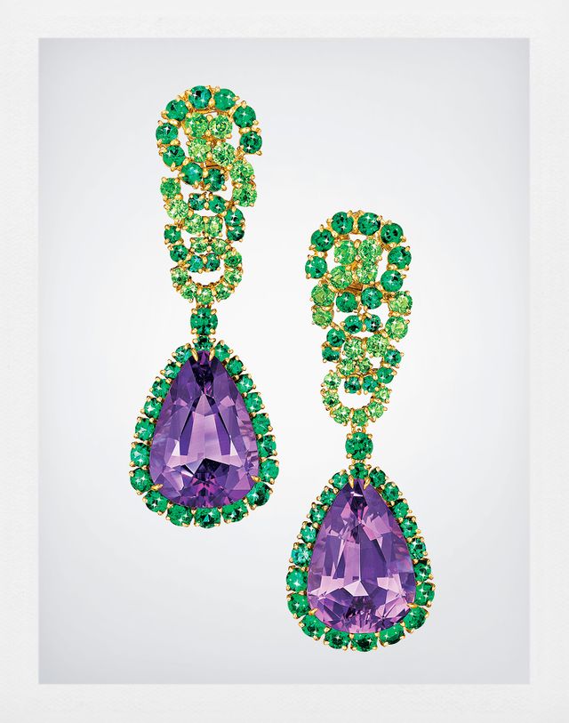 자수정과 에메랄드, 차보라이트 가닛이 세팅된 이어클립은 Verdura.