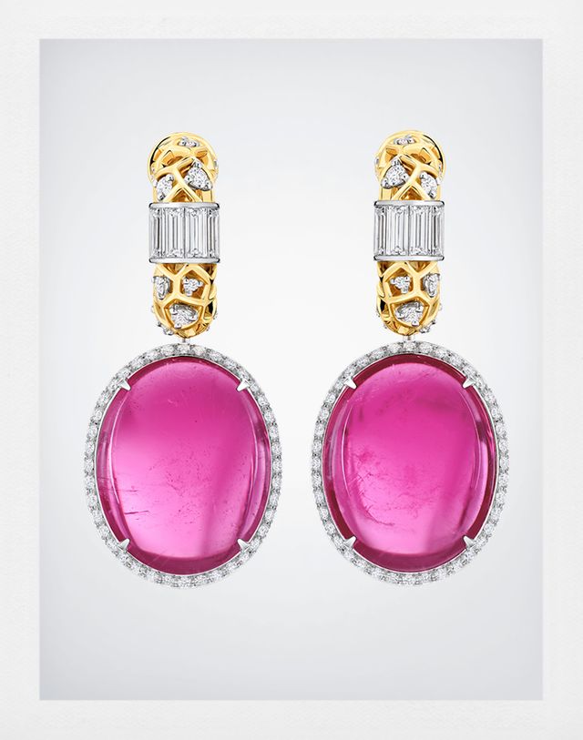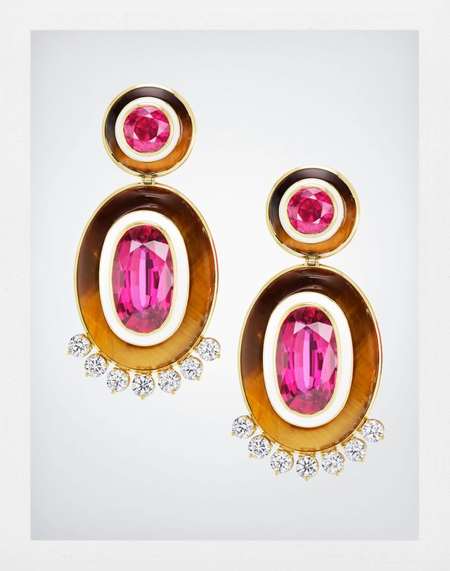 핑크 루벨라이트를 중심으로 화이트 애나멜과 타이거 아이즈가 세팅된 귀고리는 Emily P. Wheeler by Tiny Gods.
