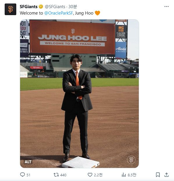 이에 앞서 샌프란시스코는 하루 전인 14일 “이정후와 계약기간 6년 총액 1억1300만 달러(약 1462억원)에 계약했다”며 “2027시즌이 끝난 뒤엔 옵트아웃(구단과 선수 합의로 계약 파기)할 수 있는 조항도 포함됐다”고 발표했다.