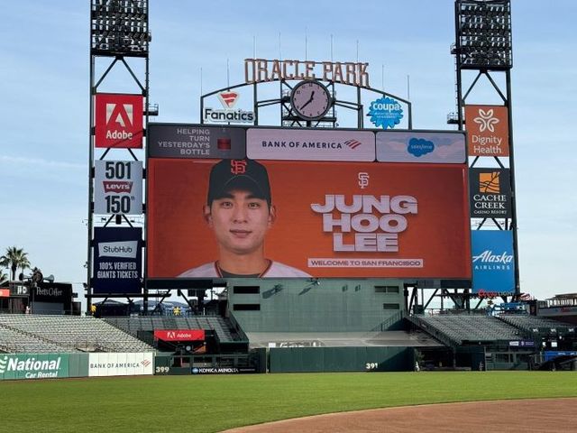이정후 입단식이 열린 15일(현지시간) 샌프란시스코 자이언츼 홈구장인 미 캘리포니아주 샌프란시스코 오라클파크 전광판에 나타난 이정후 모습. 연합뉴스