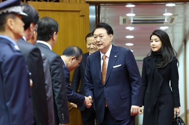 15日,在首尔机场,结束荷兰访问回国的总统尹锡悦与前来迎接的国民力量党鞭尹在玉等人致意。【图片提供 韩联社】