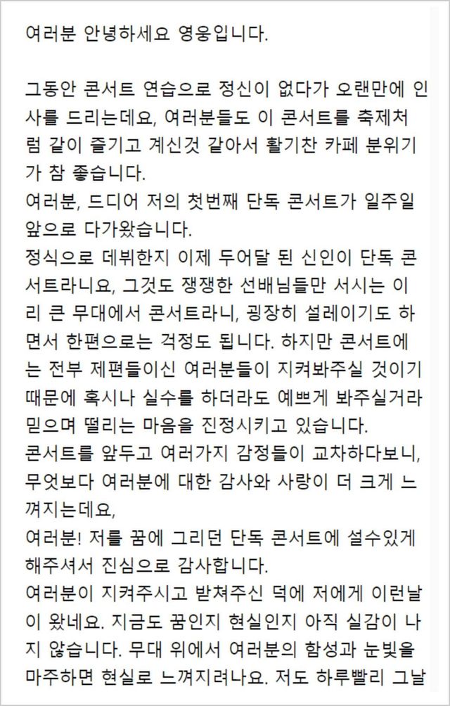 생애 첫 전국투어 콘서트를 앞두고 소감을 올린 황영웅의 글 캡처 / 황영웅 팬카페