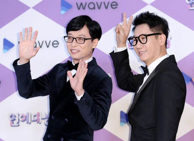 '2019 SBS 연예대상' 포토콜 행사에 참석해 포즈 취하고 있는 '런닝맨' 멤버 유재석과 지석진. / 뉴스1