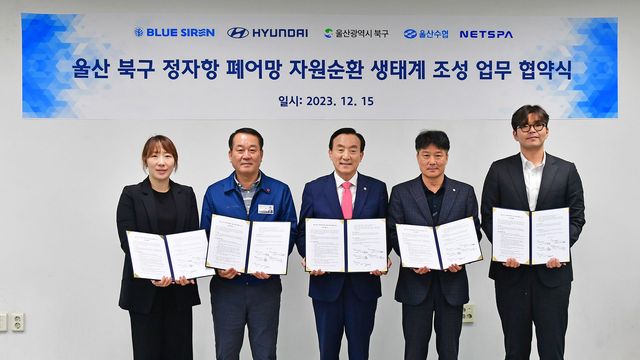 현대자동차는 15일(금) 울산 정자항에서 울산 북구청, 울산 수산업협동조합(이하 울산 수협), 폐어망 업사이클 소셜벤처기업 넷스파, 비영리 해양복원단체 블루사이렌과 ‘울산 정자항 폐어망 자원순환 체계 구축 프로젝트’를 위한 업무협약을 체결했다.