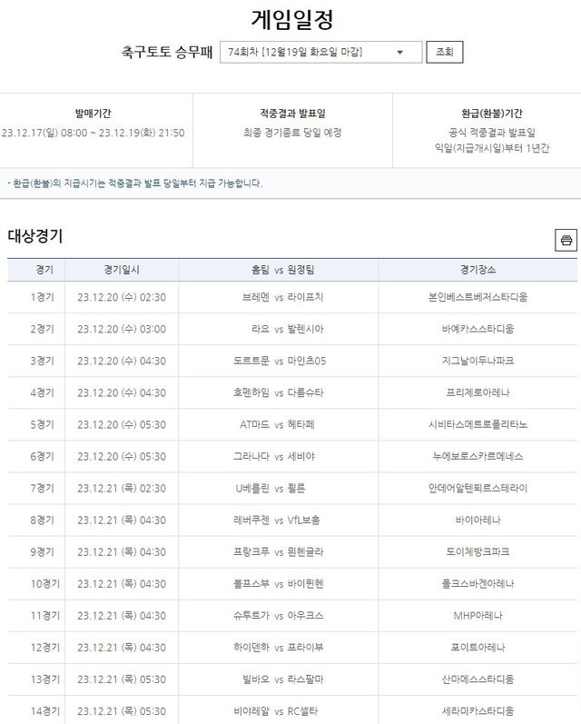 12월 19일(화) 오후 9시 50분까지 축구토토 승무패 74회차 구매 가능