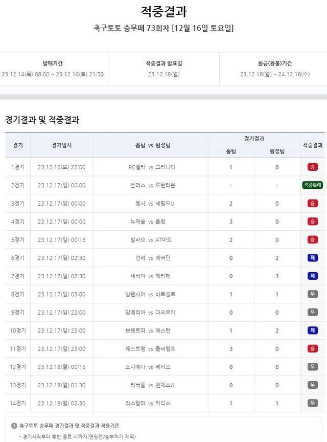 국민체육진흥공단에서 발행하는 체육진흥투표권 스포츠토토의 수탁사업자 스포츠토토코리아가 12월 16일(토)부터 18일(월)까지 진행된 잉글랜드 프리미어리그(EPL) 7경기 및 스페인 프리메라리가(라리가) 7경기 등 총 14경기를 대상으로 실시한 축구토토 승무패 73회차 게임의 적중 건수는 8254건이었으며, 총 적중금은 약 13억 원에 달했다.