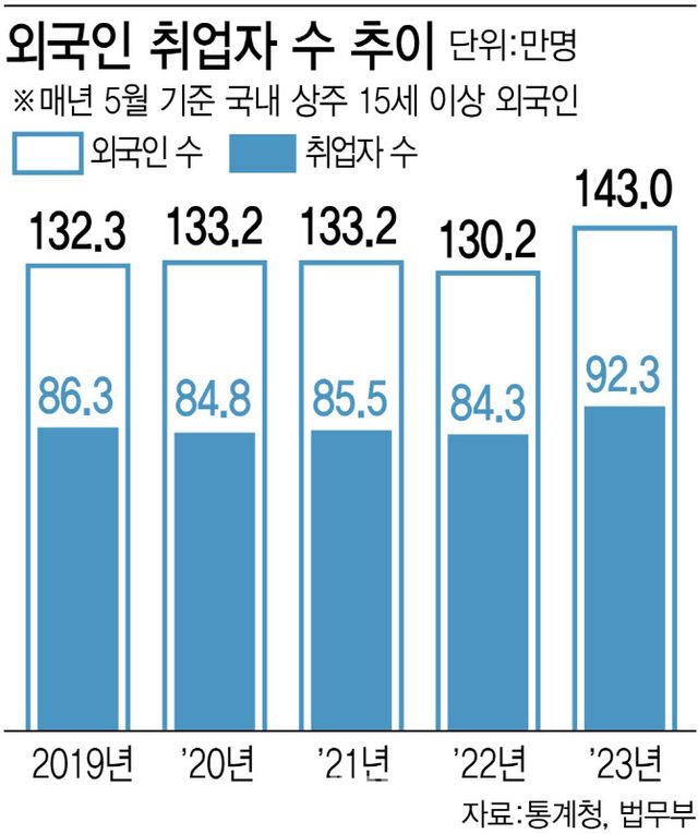 5월 기준 외국인 취업자는 92만3000명으로 전년보다 8만명 증가했다. 외국인 취업자 규모도 통계 작성 이래 최대다. 임경은 통계청 고용통계과장은 “코로나19 이후 엔데믹 상황에서 비전문 취업과 유학생들이 크게 증가하며 상주인구가 늘었다”며 “특히 비전문 취업이 6만명가량 증가한 것이 취업자 수 증가에 영향을 미쳤다”고 했다.