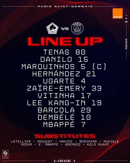 PSG가 18일(한국시간) 프랑스 노르 주 릴에 위치한 스타드 피에르-모루아에서 열린 릴과의 2023/24 리그1 16라운드 원정 경기에서 후반 막판 극장 골을 허용하며 1-1 무승부를 기록했다.