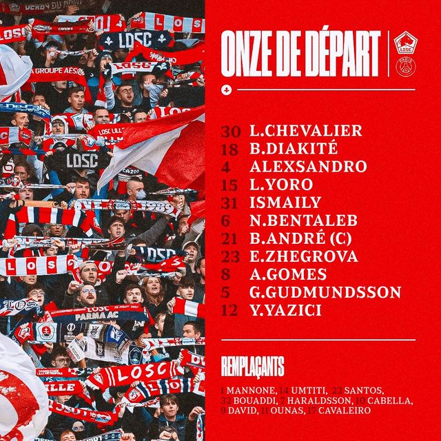 먼저 홈팀 릴은 4-2-3-1 전형으로 나섰다. 루카스 슈발리에 골키퍼를 비롯해 이스마일, 알렉산드루, 레니 요로, 바포데 디아키테가 수비를 구축했다. 3선에 나빌 벤탈렙과 안드레가 나와 수비를 보호했다. 2선에 가브리엘 구드문드손, 앙헬 고메스, 에돈 제그로바, 최전방에 유수프 야지츠가 공격에 나섰다.